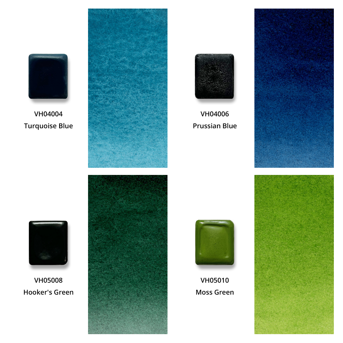Farbzusammenstellung: VH01001 – Zitronengelb, VH01003 – Indischgelb, VH02003 – Echtrot, VH03006 – Krapplack Rubin, VH04004 – Türkisblau, VH04006 – Preußischblau, VH05008 – Hookers Grün, VH05010 – Moosgrün, VH06003 – Französischer Ocker, VH06005 – Englischrot, VH08001 – Schiefergraublau, VH08003 – Warmgrau